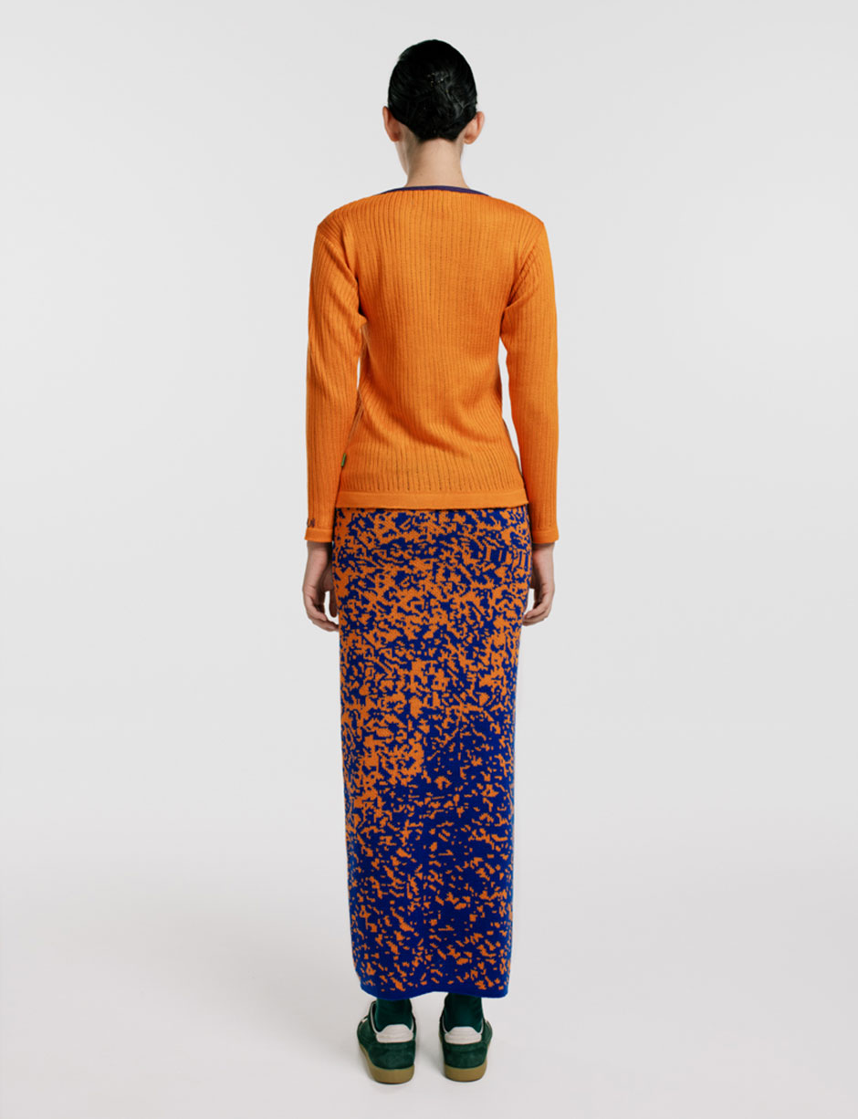 Camibuso manga larga en Hilo Hipoalergenico en color naranja con detalles morados. Fit ajustado perfecto para hacer capas con tu maglione favorito. Tejido ligero hecho tejedora rectilinea, terminado y bordado a mano. Hecho en Boyacá, Colombia.