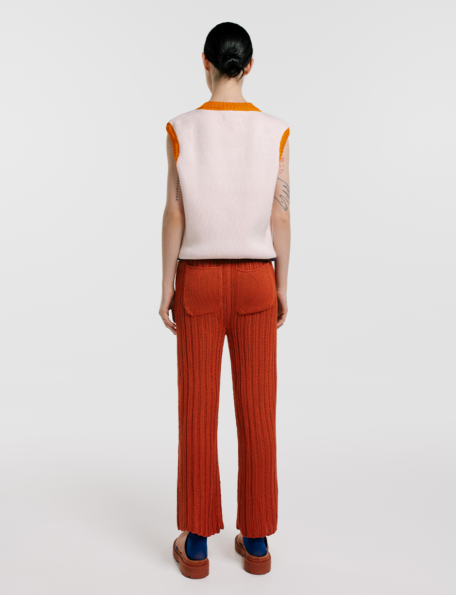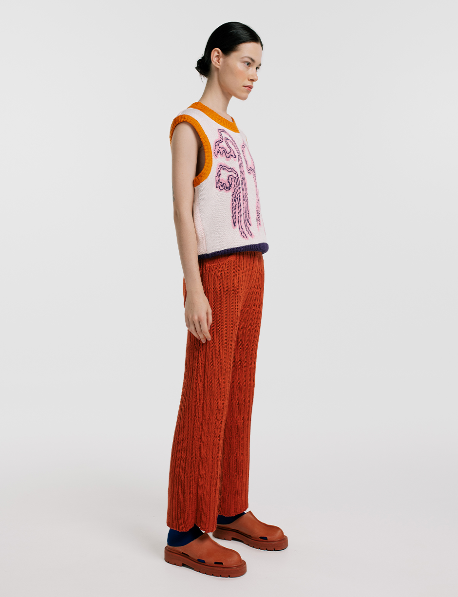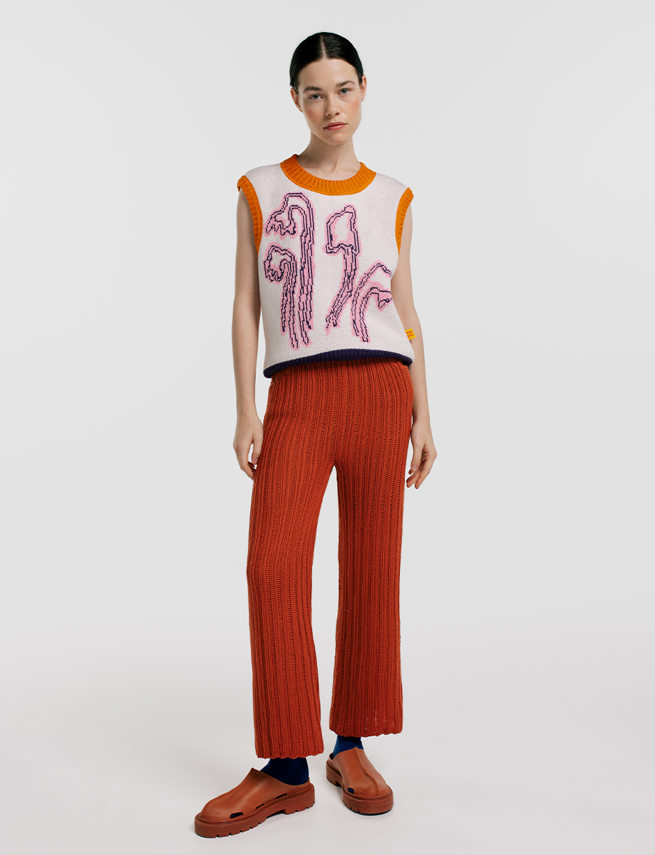 Chaleco cuello redondo en Hilo Hipoalergénico 60 % Acrílico y 40% Algodón en color marfil con print flor de páramo. Fit oversized y tejido de punto. Terminado y bordado a mano.  Hecho en Sogamoso, Boyacá, Colombia.
