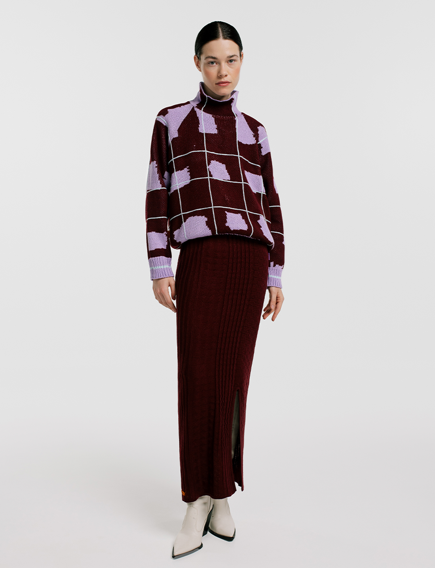 Sweater tejido con patrón tipo tartán en tonos verdes. Tejido de punto en algodón. Tonos de lila y vinotinto con fondo crudo. Silueta regular. Patrón diseñado y tejido en máquina. Hecho artesanalmente en Sogamoso, Boyacá.. Disponibilidad en todas las tallas.