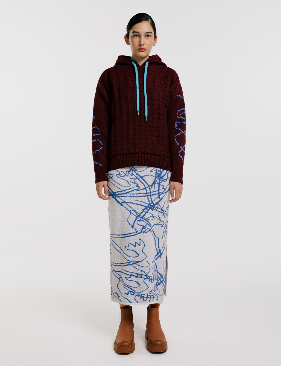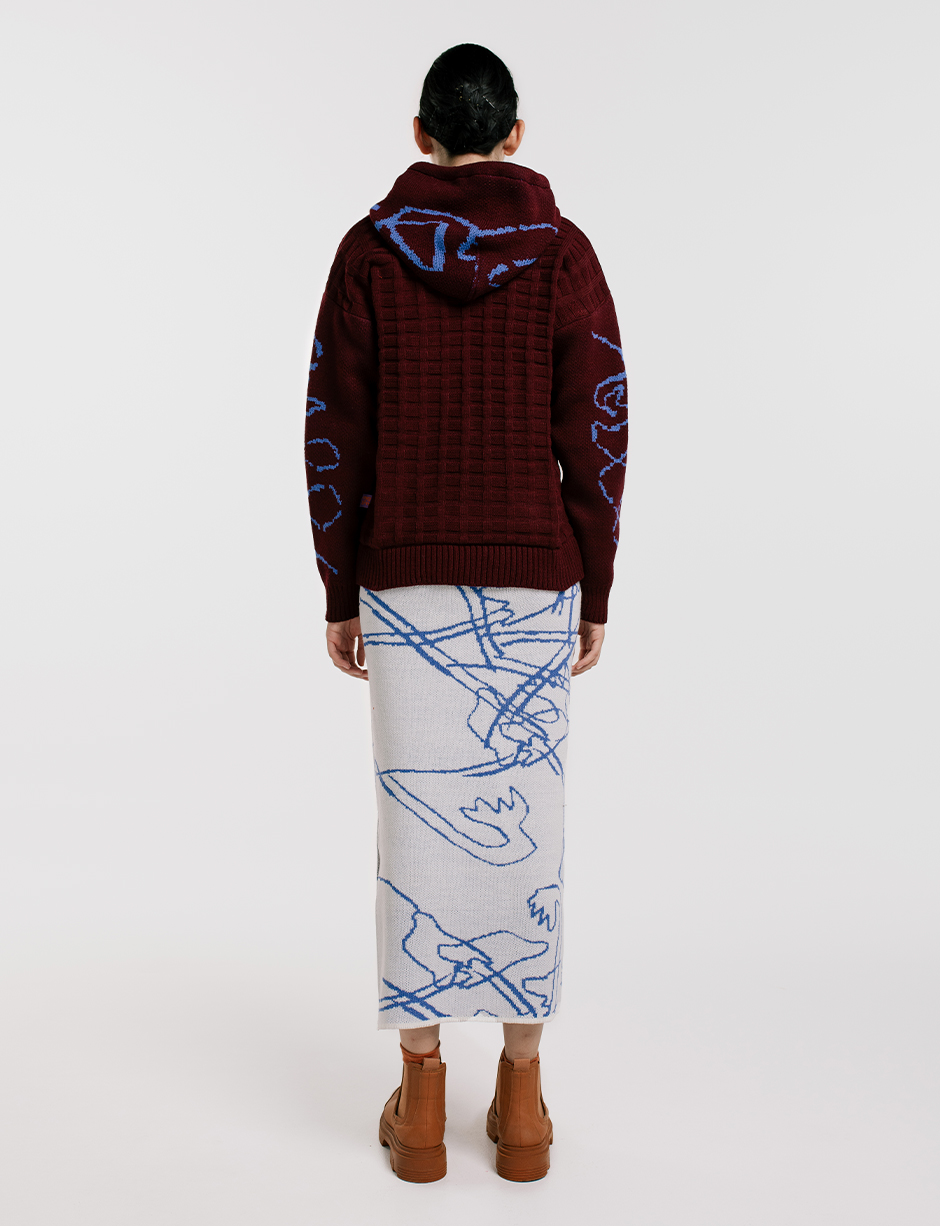 Hoodie tejido en Hilo Hipoalergénico Algodón con print de líneas punteadas . Fit relajado ideal para climas templados. Tejido de punto, terminado y bordado a mano. Hecho en Sogamoso, Boyacá, Colombia.