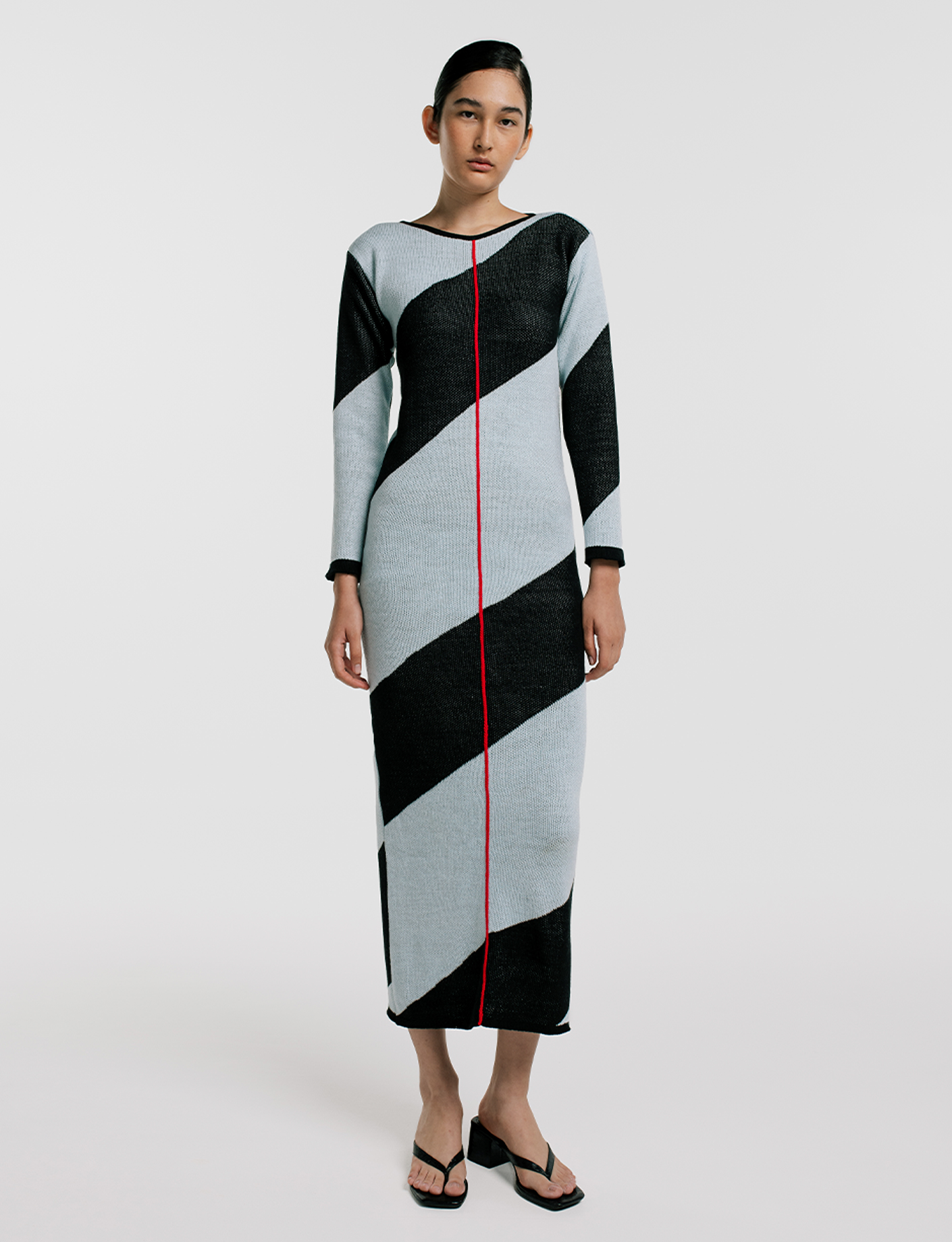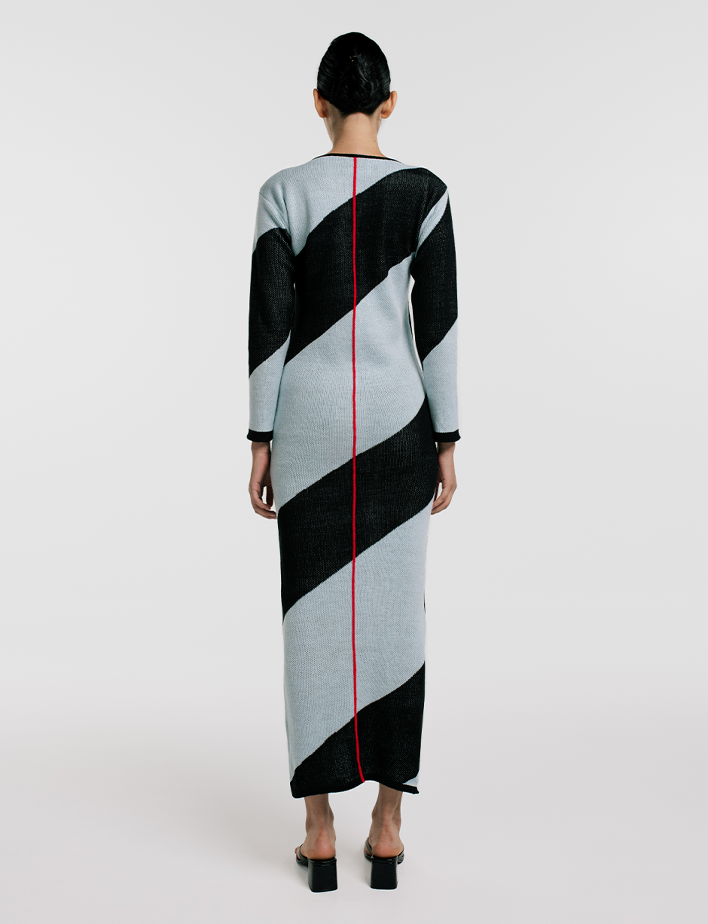 Vestido tejido en Hilo Hipoalergénico con manga larga y print de líneas diagonales en tonos azul, negro y blanco. Silueta entallada de largo medio. Tejido de punto, terminado y bordado a mano. Hecho artesanalmente en Sogamoso, Boyacá. Disponibilidad en todas las tallas.
