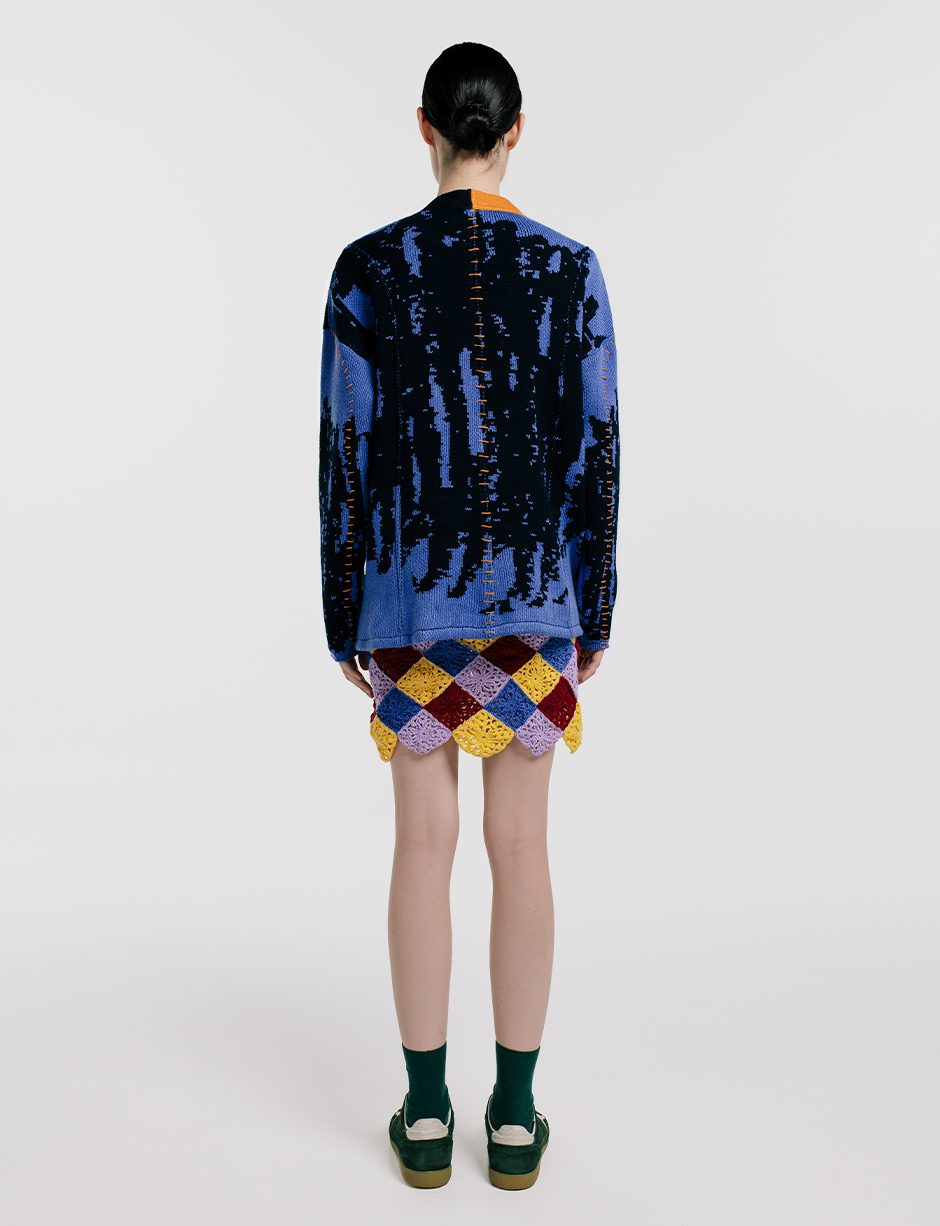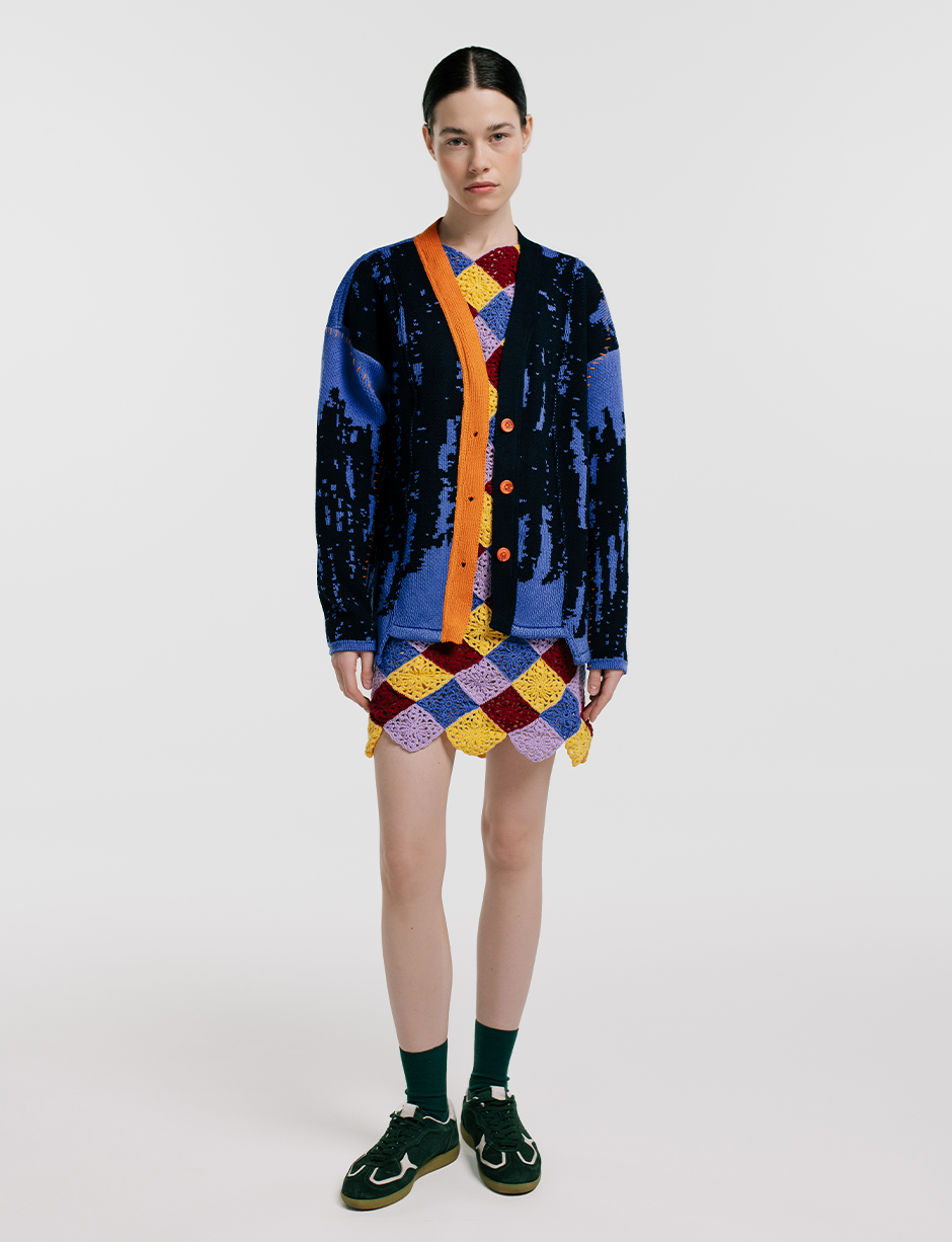Cardigan largo tejido en Hilo Hipoalergénico con diseño gráfico abstracto en colores vibrantes. Fit amplio y silueta envolvente. Tejido de punto, terminado y bordado a mano. Hecho en Sogamoso, Boyacá, Colombia.