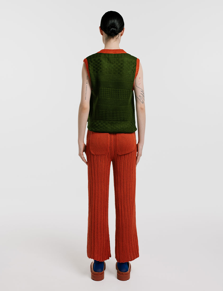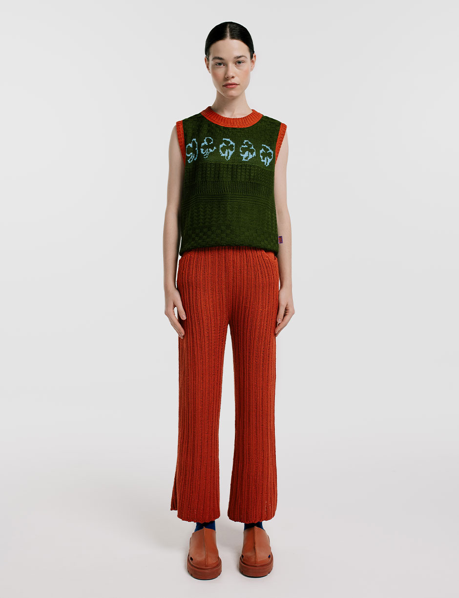 Chaleco cuello redondo en Hilo Hipoalergénico en verde militar con print de trebol. Fit oversized y tejido de punto. Terminado y bordado a mano. Hecho en Sogamoso, Boyacá, Colombia.
