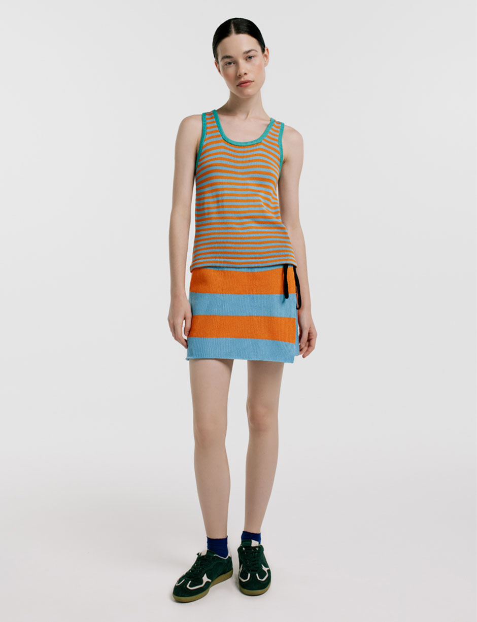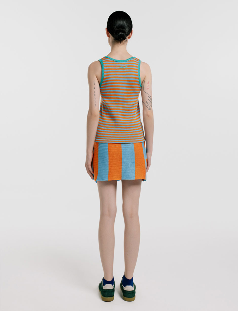 Tank top cuello redondo en Hilo en print verano en color naranja y aguamarina. Tejido ligero hecho en telar artesanal, terminado y bordado a mano. Hecho en Sogamoso, Boyacá, Colombia.
