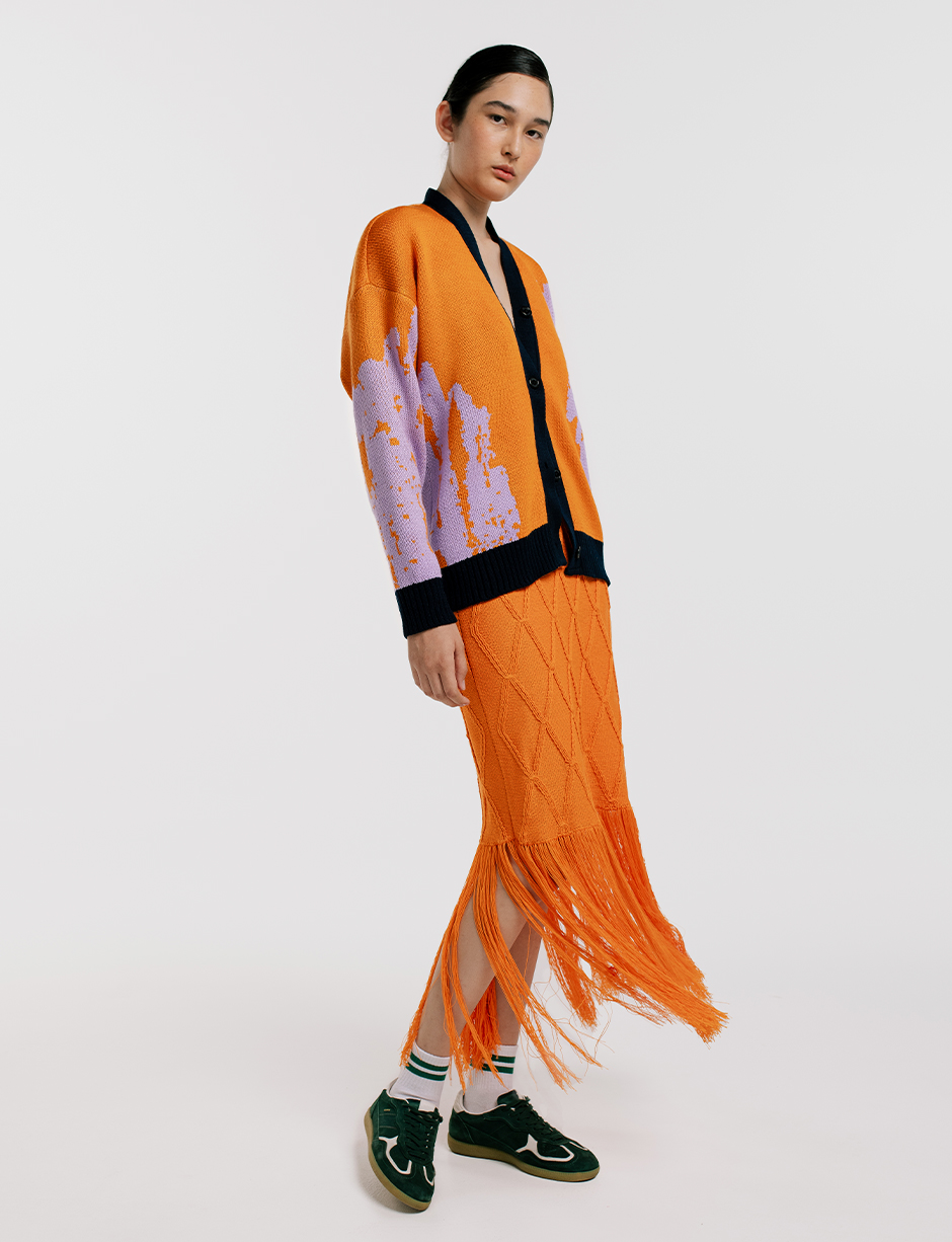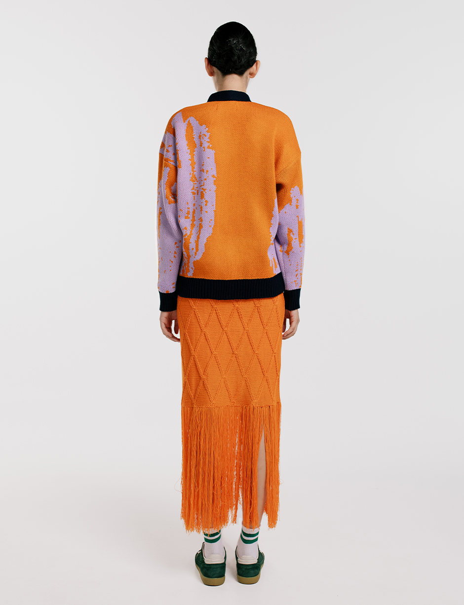 Falda larga en malla tejida de Hilo Hipoalergénico . Fit recto y liviano para estilismos versátiles y layering. Tejida de punto, terminada y bordada a mano. Hecho en Sogamoso, Boyacá, Colombia.