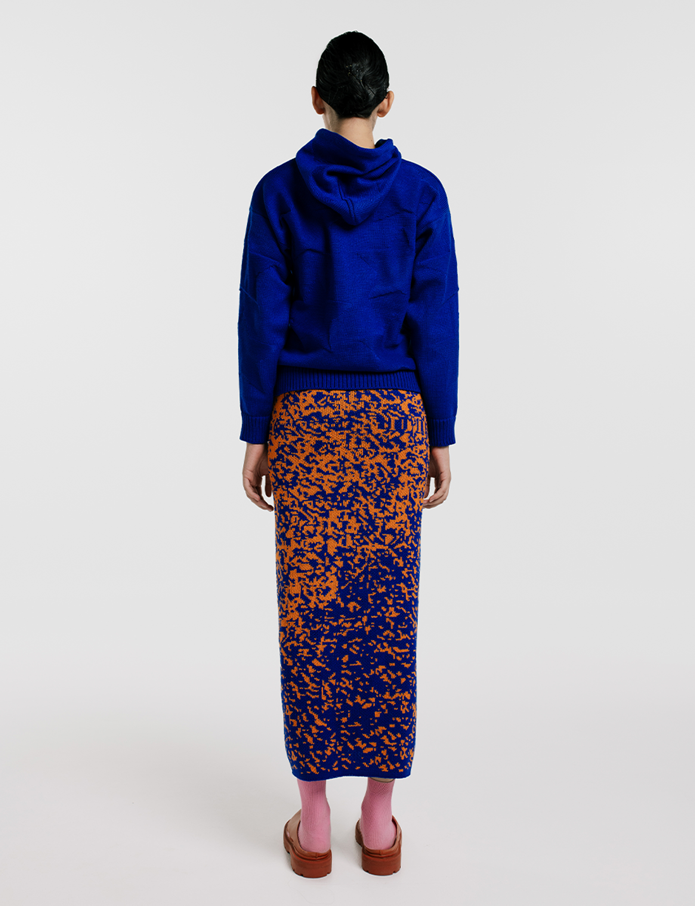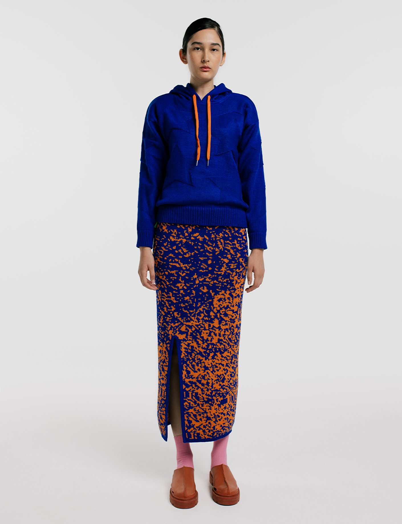 Hoodie tejido en Hilo Hipoalergénico con textura de estrellas tejidas en relieve sobre fondo azul. Fit cómodo, perfecto para usar a diario. Tejido de punto, terminado y bordado a mano. Hecho en Sogamoso, Boyacá, Colombia.