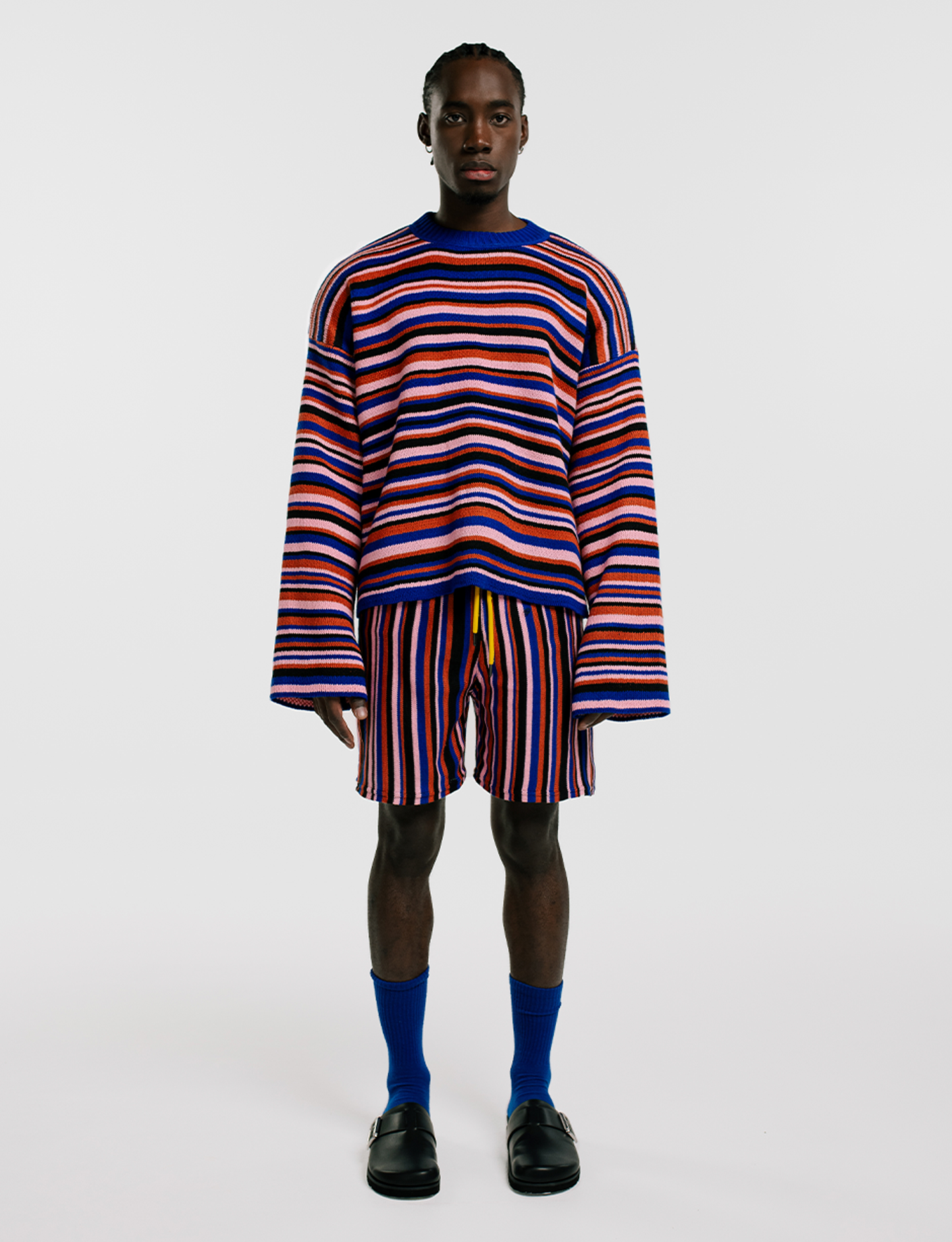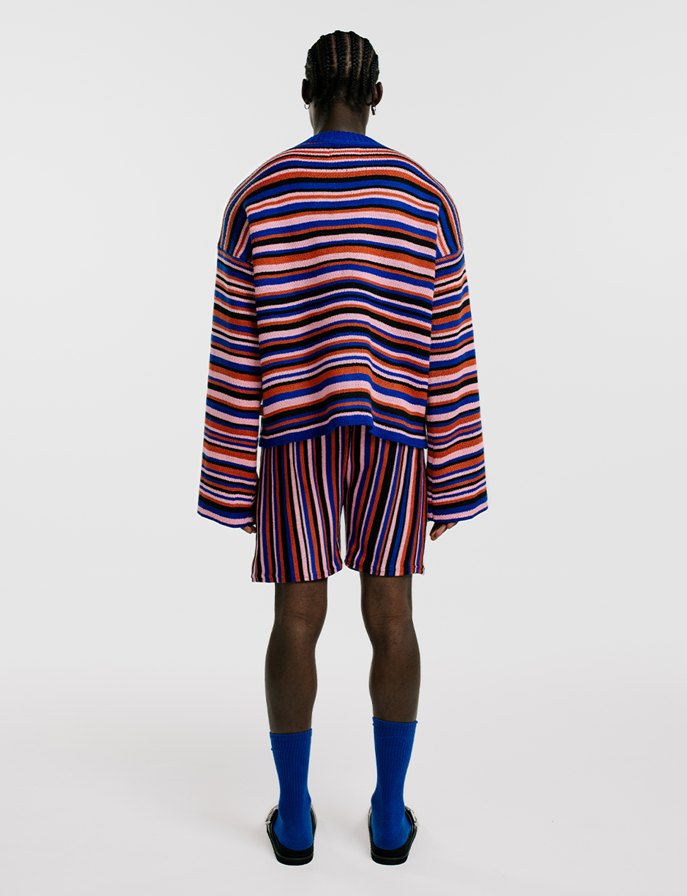 Sweater con franjas horizontales en colores vibrantes. Tejido de punto. Multicolor con fondo oscuro.