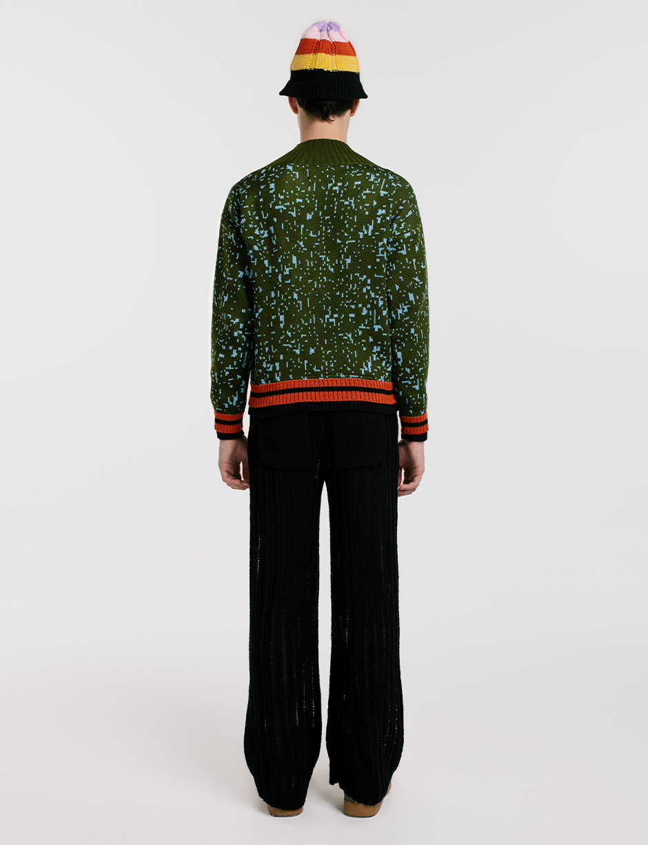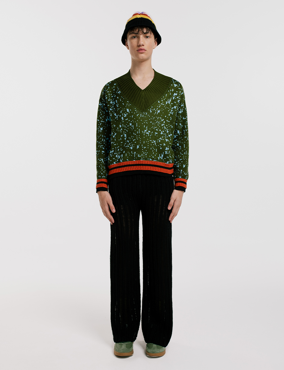 Sweater con cuello en V y diseño de pixeles. Colores: Verde Militar, terracota y azul. Fit suelto. Diseño tejido con detalles a mano. Hecho en Sogamoso, Boyacá, Colombia.