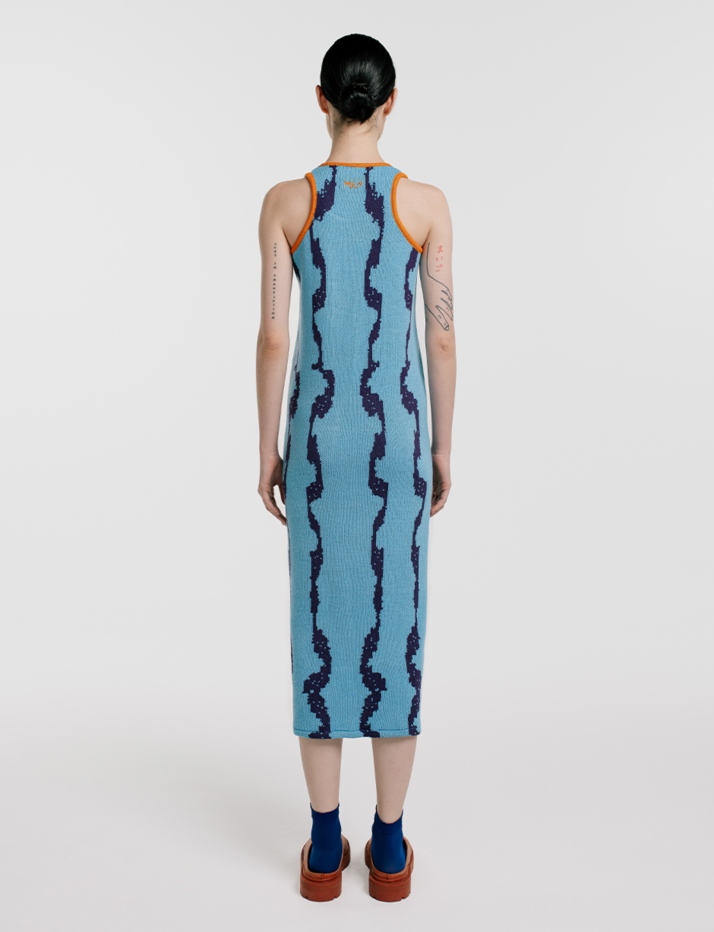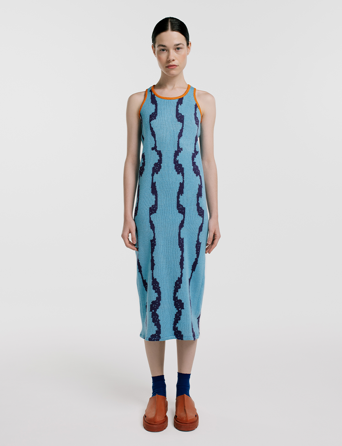 Vestido tejido en Hilo Hipoalergénico con print de serpentinas en tonos contrastantes. Silueta recta con manga sisa y cuello cerrado. Tejido de punto, terminado y bordado a mano. Hecho artesanalmente en Sogamoso, Boyacá. Disponibilidad en todas las tallas.